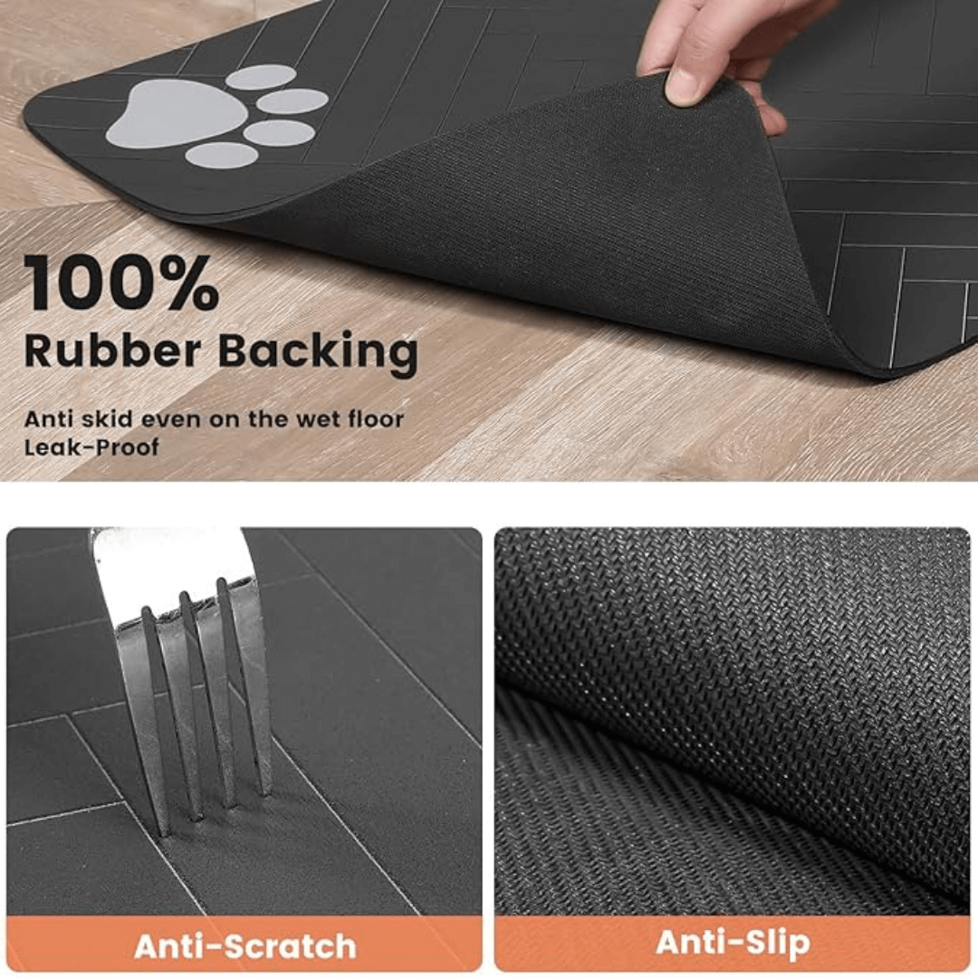 Non-slip & No leaksThe non-slip rubber backing of our dog dish mat ensures that it stays in place. Excellent leak protection is offered by the waterproof rubber bottom, which stops water from leaking into the floor and causing damage.